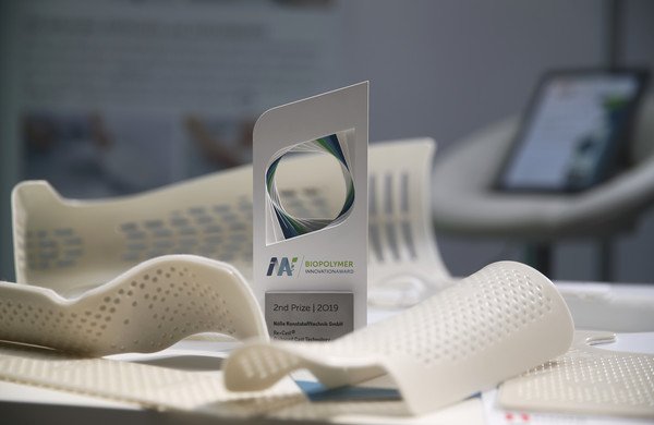 The greatest possible proximity to customers is also the working principle of Nölle Kunststofftechnik GmbH, even in the development phase of their re+casts®. With the innovation, the familiy company secured second prize in 2019. The splints for immobilizing bone fractures developed with the Fraunhofer IAP in Potsdam and the St. Walburga Hospital in Nölle’s hometown Meschede offered several advantages over common systems: While conventional casts have to be replaced and disposed of when changes occur in the treated limbs (e.g. after swelling has reduced), the re+casts® could be readjusted several times under infrared light. The rails made from the bio-based plastic PLA could also be industrially composted at the end of their useful life. The aim was to avoid a significant proportion of the up to 150 tonnes of cast waste per year in Germany and to make unavoidable waste part of natural cycles again.